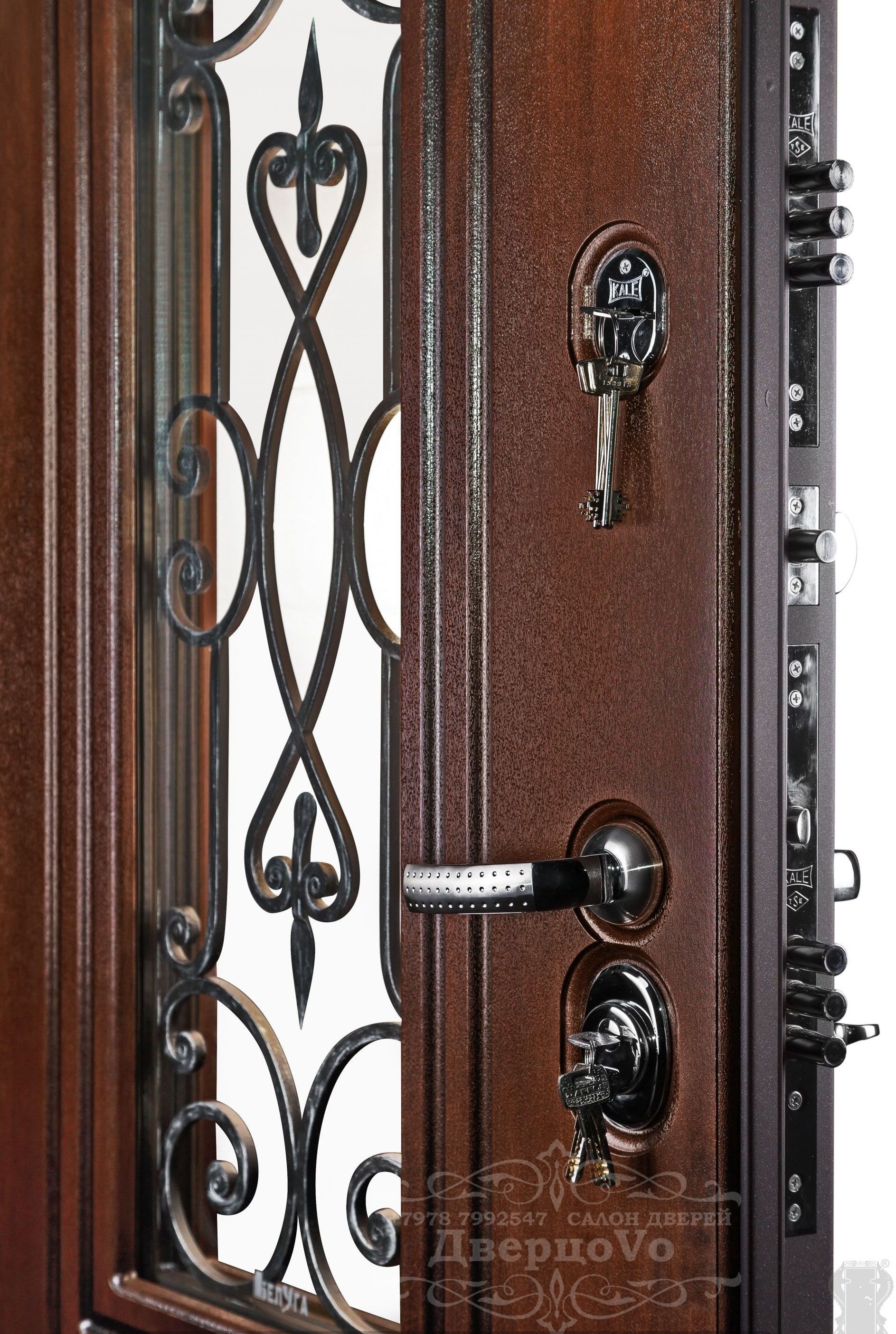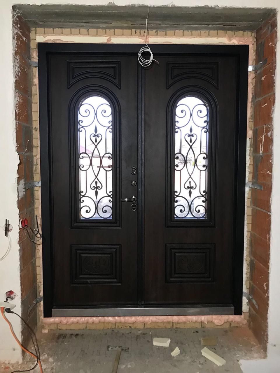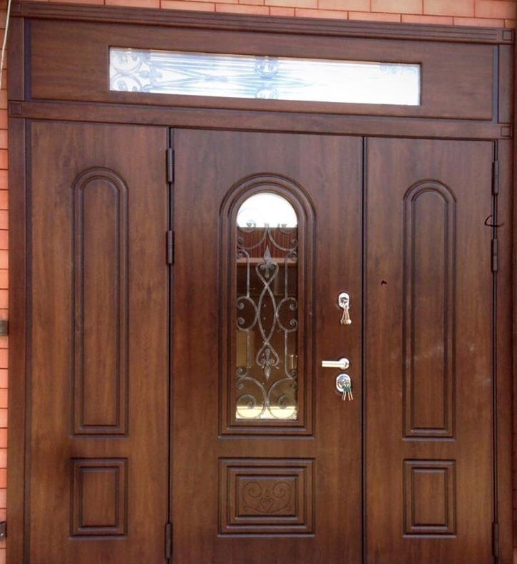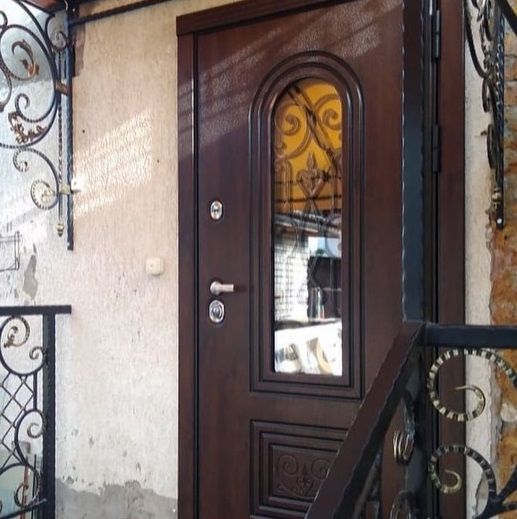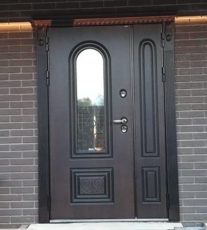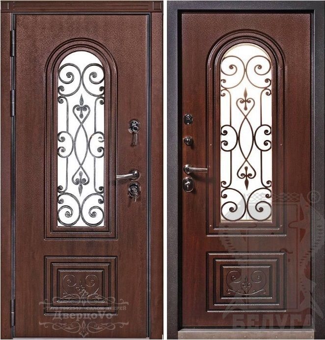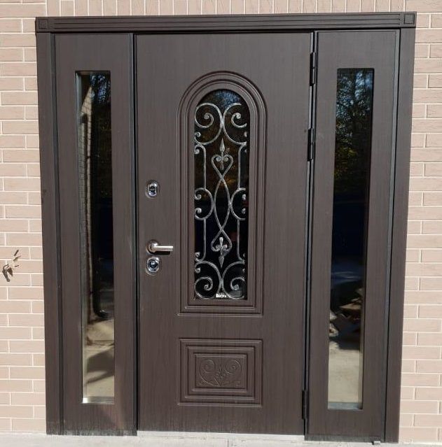 Внешняя отделка: Ковка "СЕВИЛЬЯ", внутри стеклопакета, стеклопакет зеркальный 3-х камерный, объемная фрезерованная панель «СЕВИЛЬЯ» из влагостойкой МДФ (пр-во Бельгия) 16мм, цвет «Дуб темный» с черной патиной + лаковое покрытие, тип пленки – «VINORIT» (пр-во Израиль) с фрезерованными наличниками;