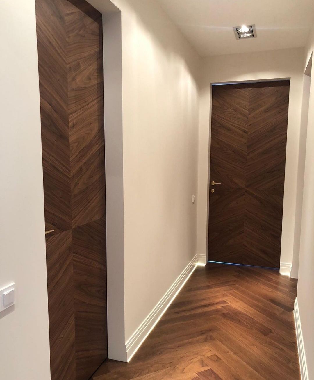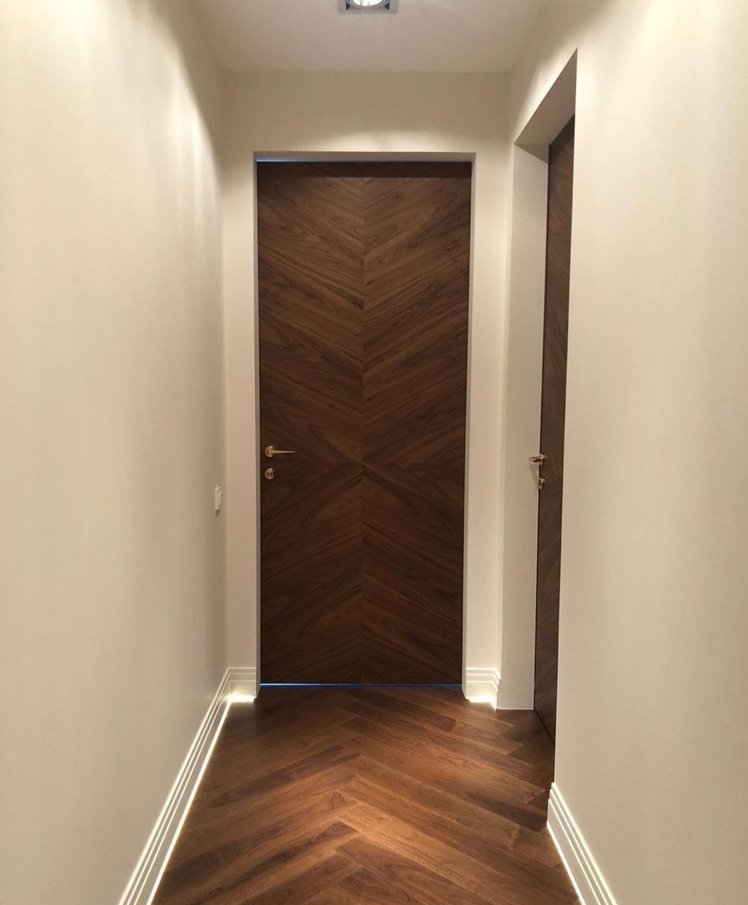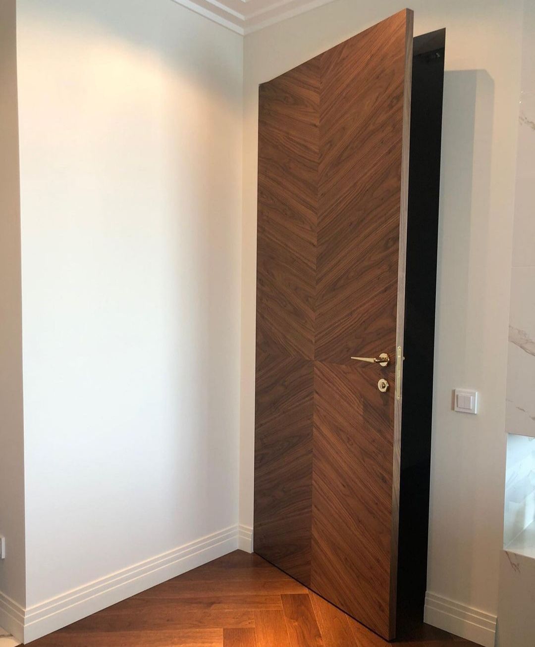 Скрытая шпонированная дверь подойдет для любого классического или современного интерьера, при этом лучше всего она впишется в интерьер, при создании которого использовалось много элементов из натуральной древесины или декоративных материалов «под дерево». Отделка двери выполняется либо дорогим строганым шпоном, либо шпоном fine-line. Шпонированные двери-невидимки можно устанавливать не только в жилые помещения, но также в ванные комнаты, туалеты и кухни, при условии наличия дополнительного покрытия.
