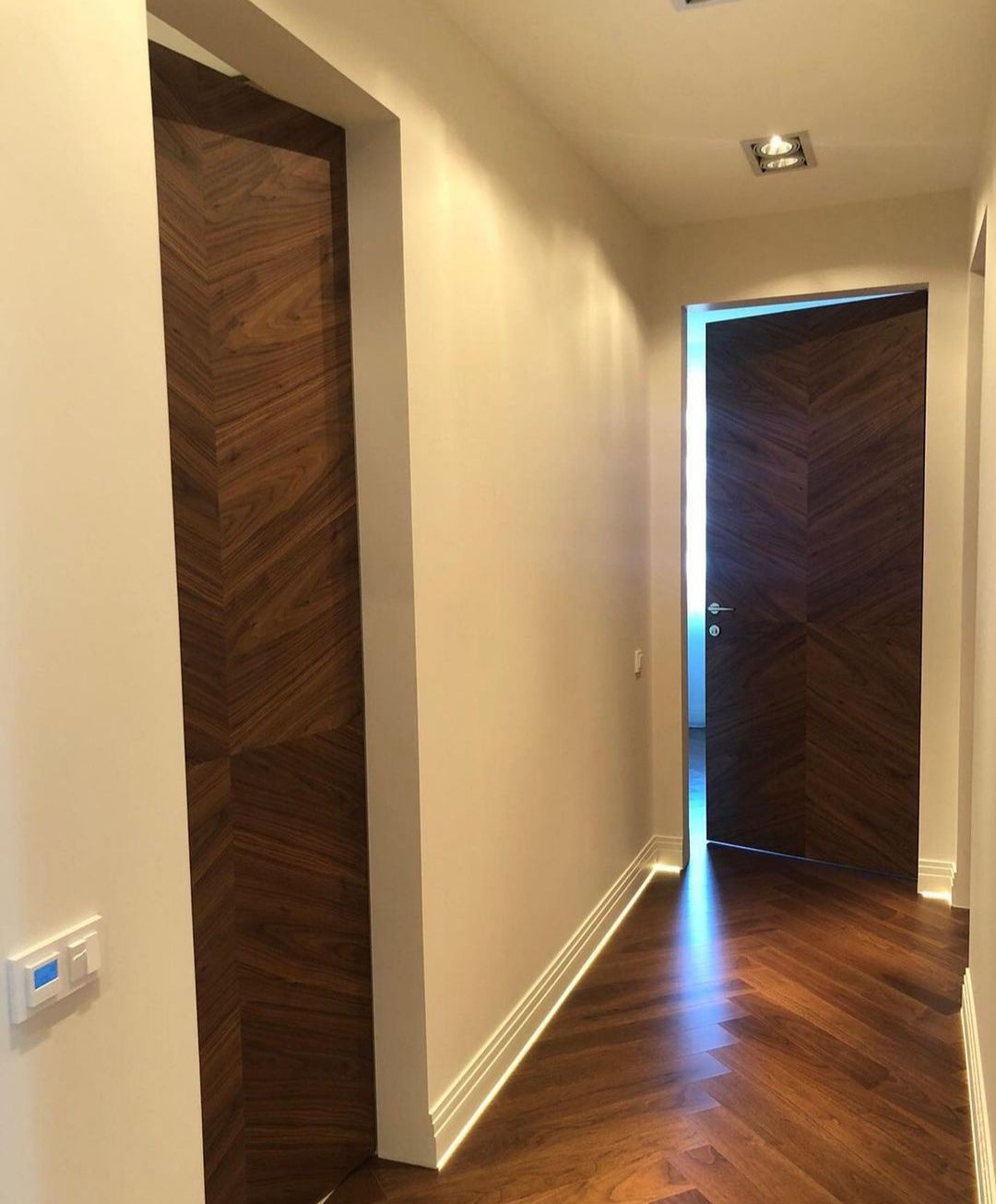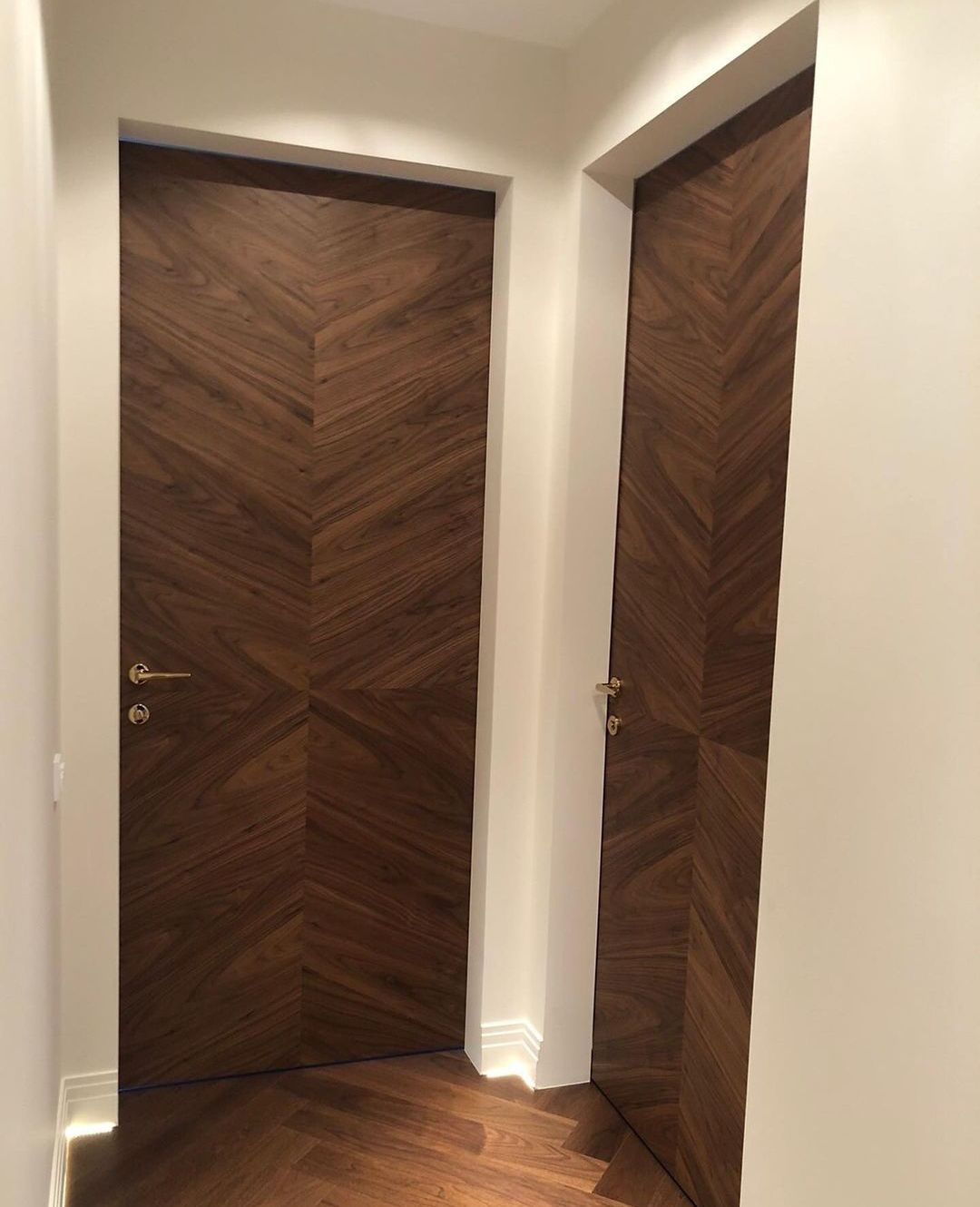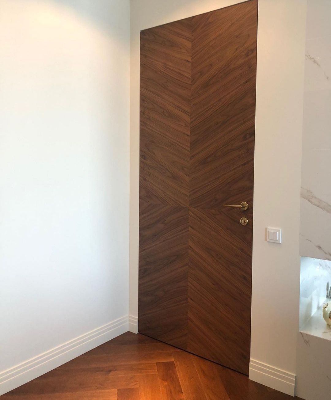 Скрытая шпонированная дверь подойдет для любого классического или современного интерьера, при этом лучше всего она впишется в интерьер, при создании которого использовалось много элементов из натуральной древесины или декоративных материалов «под дерево». Отделка двери выполняется либо дорогим строганым шпоном, либо шпоном fine-line. Шпонированные двери-невидимки можно устанавливать не только в жилые помещения, но также в ванные комнаты, туалеты и кухни, при условии наличия дополнительного покрытия.