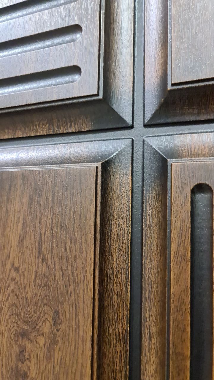 ВНЕШНЯЯ ОТДЕЛКА: влагостойкая МДФ панель 16 мм, покрытие Vinorit, цвет "ГРЕЦКИЙ ОРЕХ", патина черная, фрезеровка "ЦЕЗАРЬ"