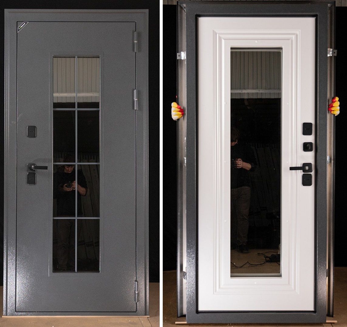 НАРУЖНАЯ ОТДЕЛКА: стальной лист 1,5 мм, цвет "ГРАФИТ БУКЛЕ", ЦИНКОГРУНТ, 2-х КАМЕРНЫЙ СТЕКЛОПАКЕТ, КОВКА ВНУТРИ СТЕКЛОПАКЕТА