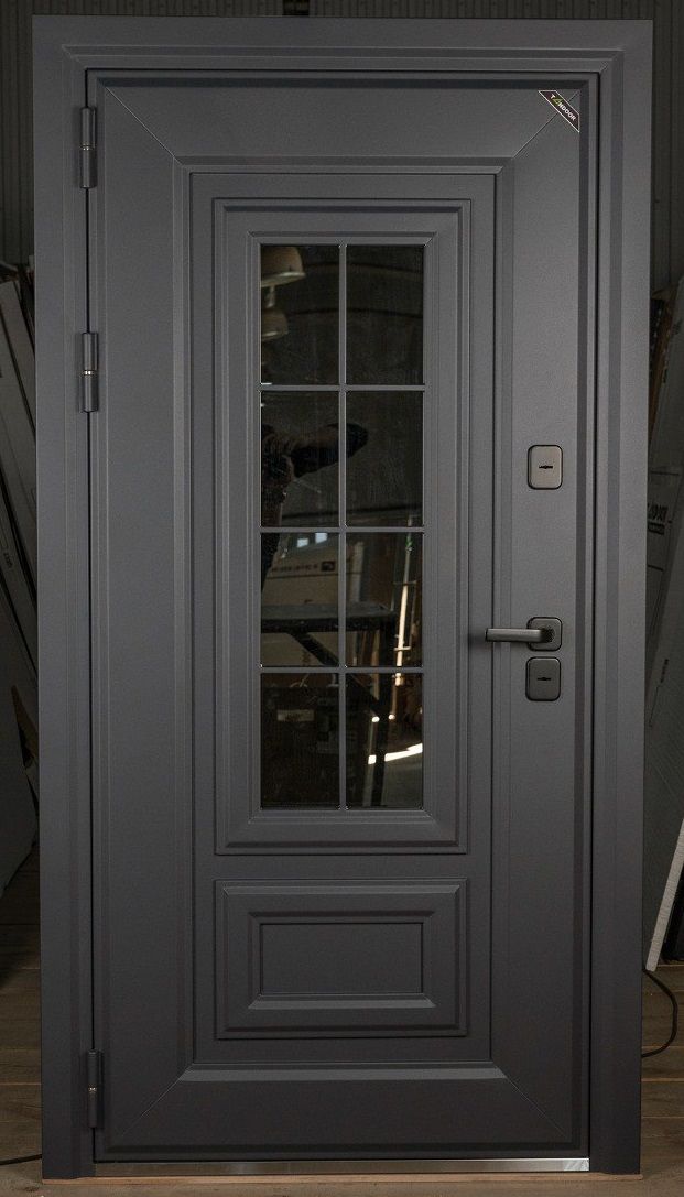 НАРУЖНАЯ ОТДЕЛКА: стальной лист 1,8 мм, цвет "МУАР СЕРЫЙ Ral 7024", 2-х КАМЕРНЫЙ ЗЕРКАЛЬНО-ТОНИРОВАННЫЙ СТЕКЛОПАКЕТ