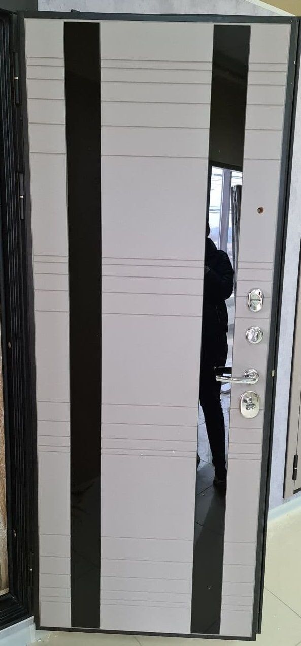 ВНУТРЕННЯЯ ОТДЕЛКА: МДФ панель 14 мм, цвет "КВАРЦ СОФТ", , вставка из черного стекла Lacobel