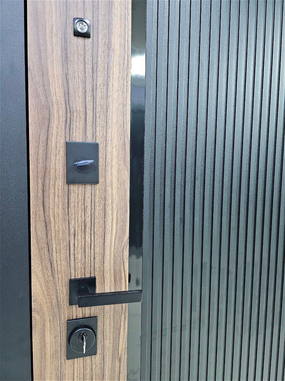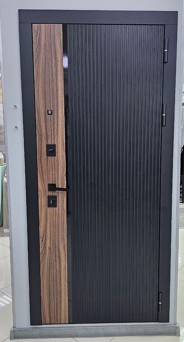 Внешнее покрытие: фрезерованная МДФ панель 10 мм, цвет "ШАГРЕНЬ ЧЕРНАЯ + ДУБ НАТУРАЛЬНЫЙ" с вертикальной вставкой из стекла Lacobel в черном цвете